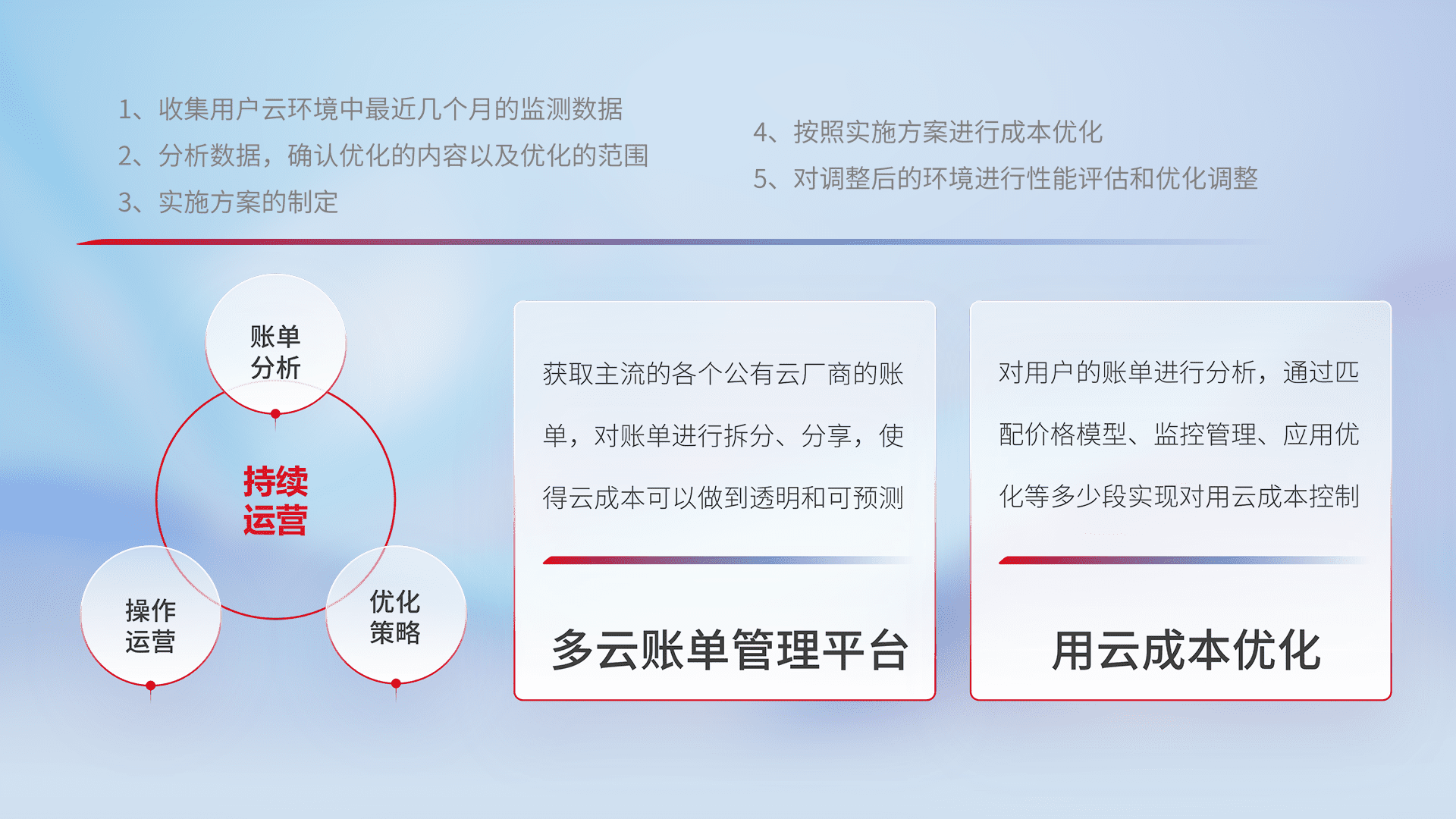 通过多云纳管,,,,以统一的资源数据模型把客户的云资源进行抽象和封装,,,,进而实现对多云资源的统一操作,,,,保障云资源管理的可靠性、、稳定性与可用性。。。。量身定制化运维内容,,配置、、、、开发运维、、补丁管理、、、备份、、、监控、、认证和访问管理、、、审计和日常巡检等,,保障在用云过程中的可靠度,,,,稳定度以及高可用率。。